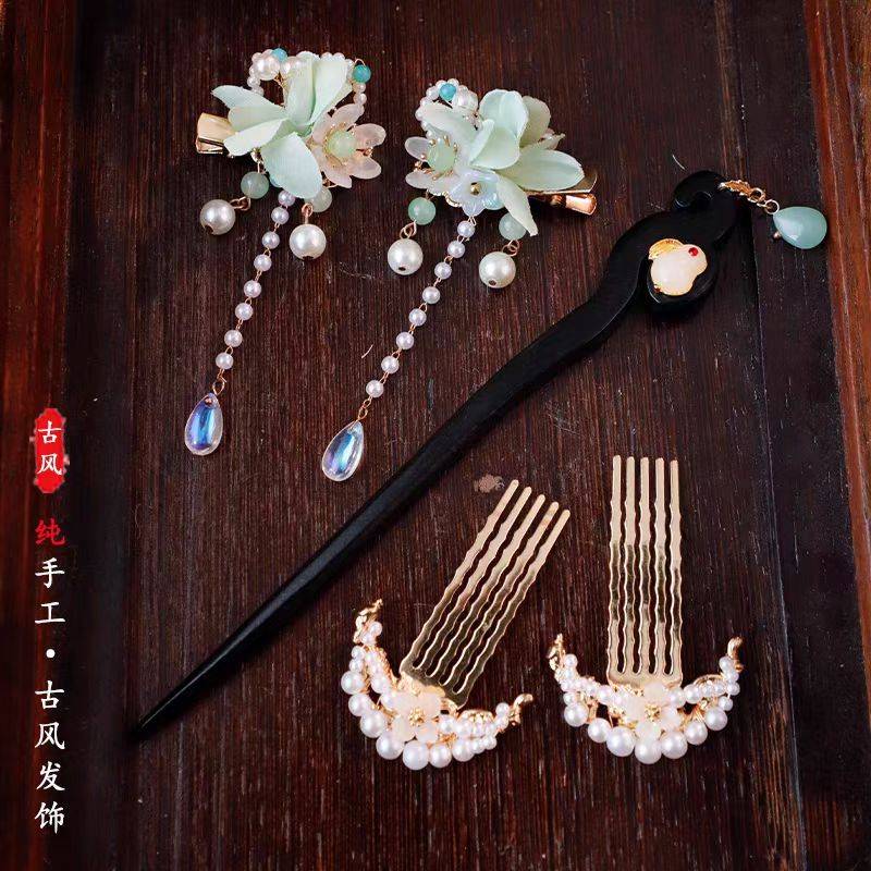 汉服头饰套装唐风宋制日常发饰黑檀木发簪明制掩鬓珍珠发梳发夹