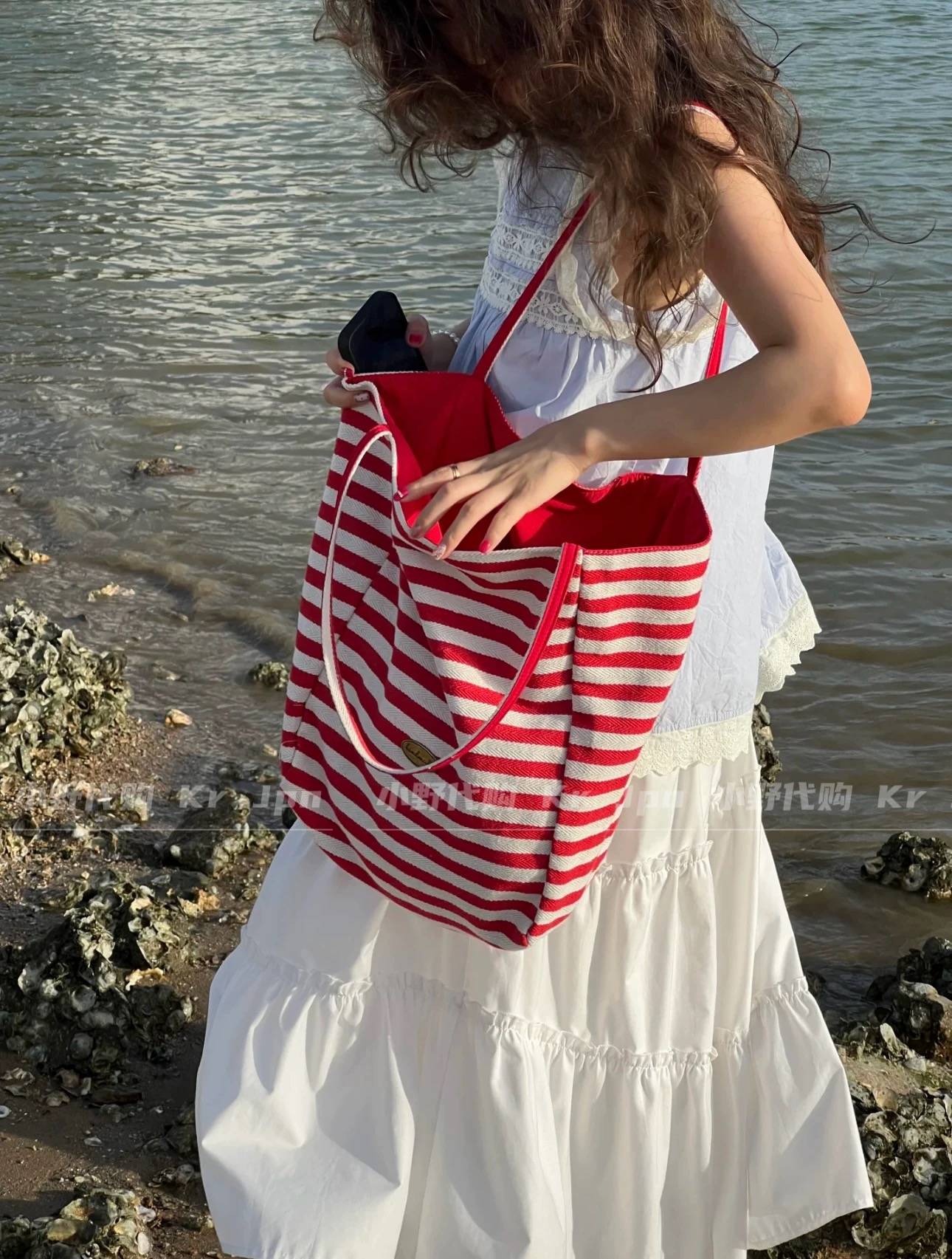 女大容量条纹单肩帆布袋