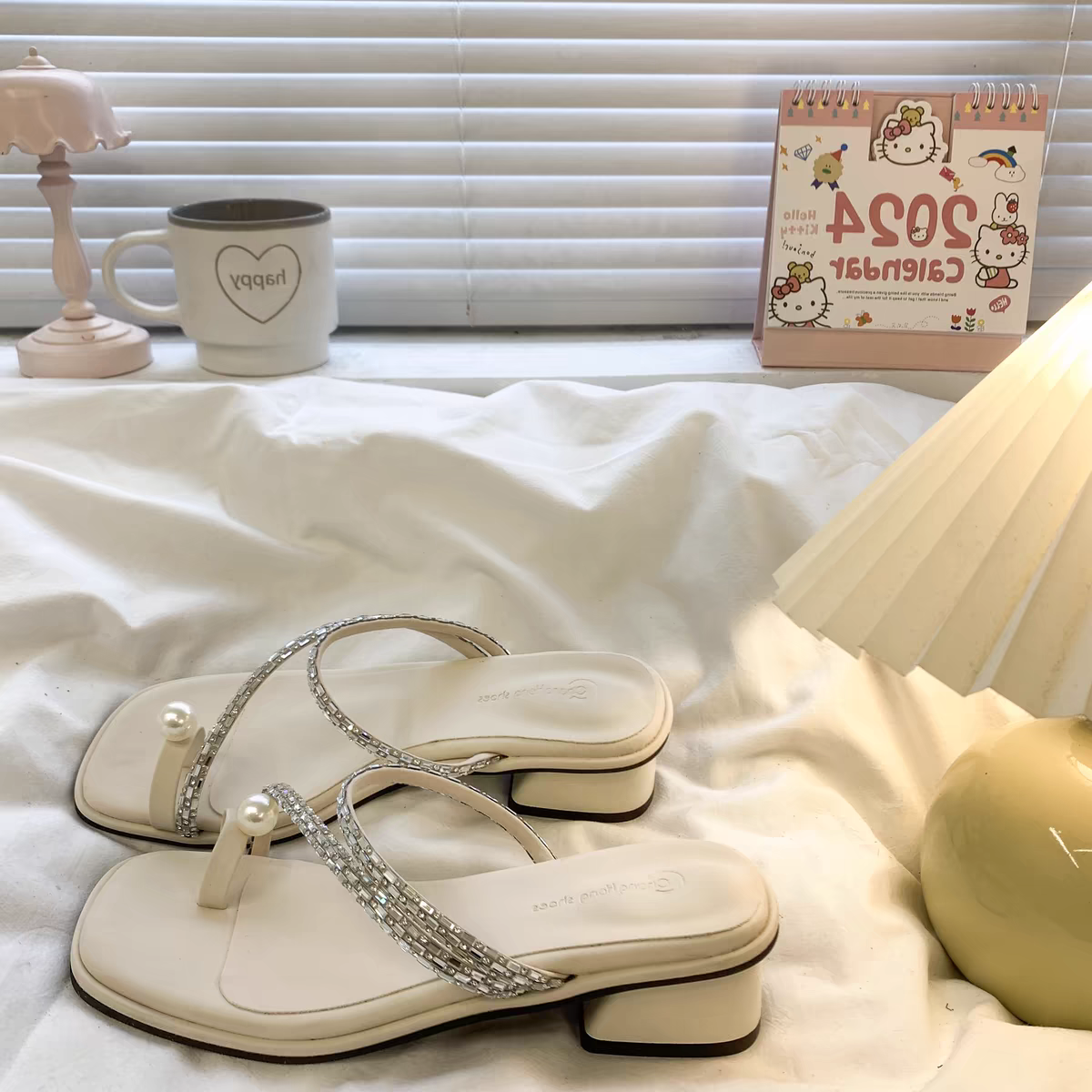仙女风粗跟套趾珍珠凉拖鞋女外穿2024夏新款水钻中跟罗马夹趾凉鞋