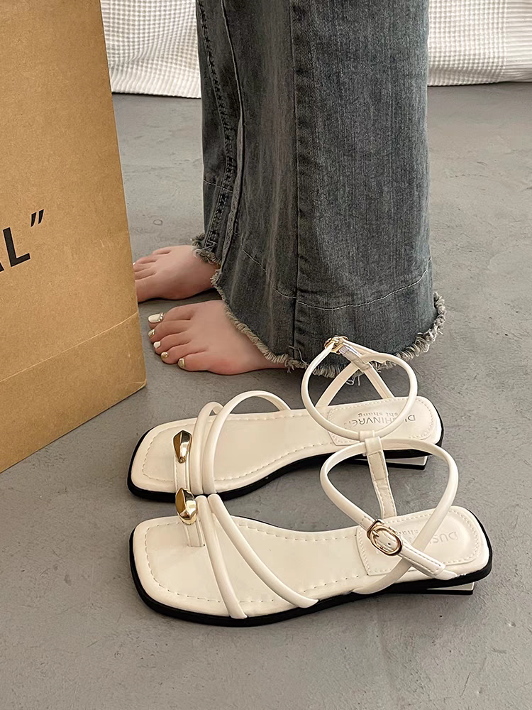 一字带女士凉鞋夏季外穿2024新款网红爆款银色平底度假沙滩罗马鞋