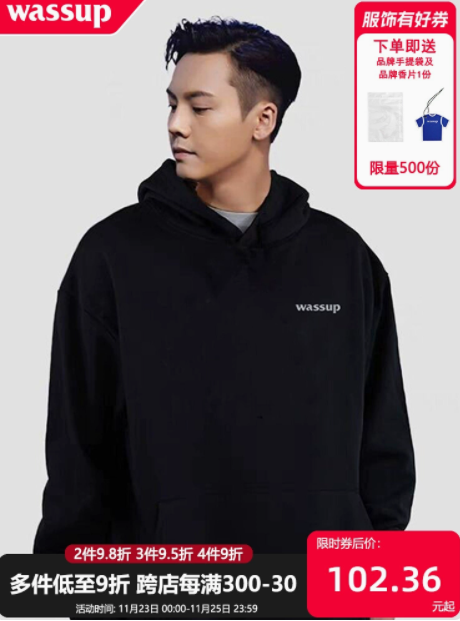 WASSUP小字母卫衣男生连帽高街国潮牌ins秋冬加绒重磅连帽衫外套