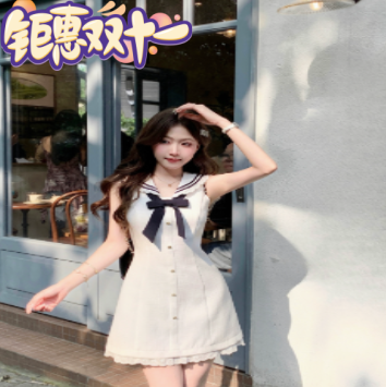 Q女家 漫高艺术生/法式海军领连衣裙夏季甜美学院风减龄无袖裙子