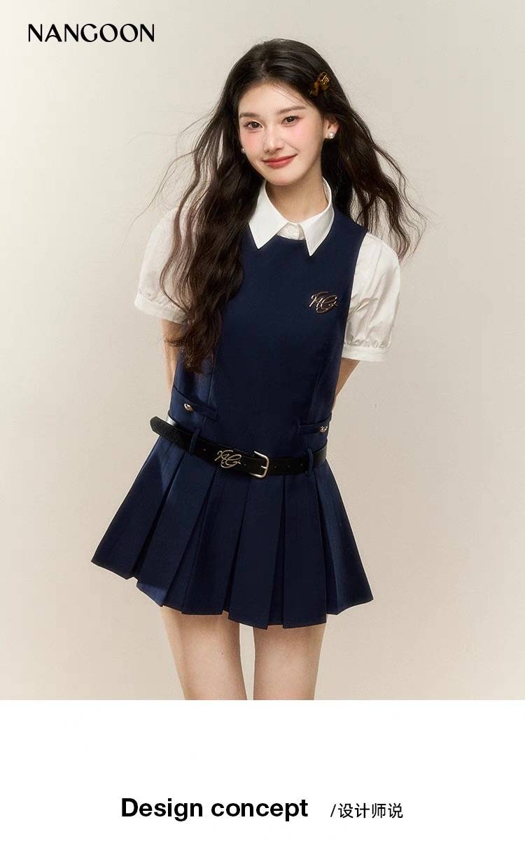 原创设计感百搭白色收腰衬衫短袖上衣无袖百褶连衣裙套装
