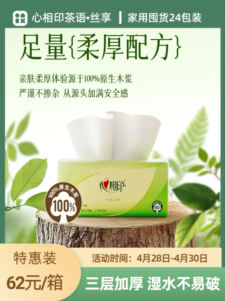 心相印抽纸【肖战同款】茶语丝享3层150抽*24包加大M码 纸巾 卫生纸整箱