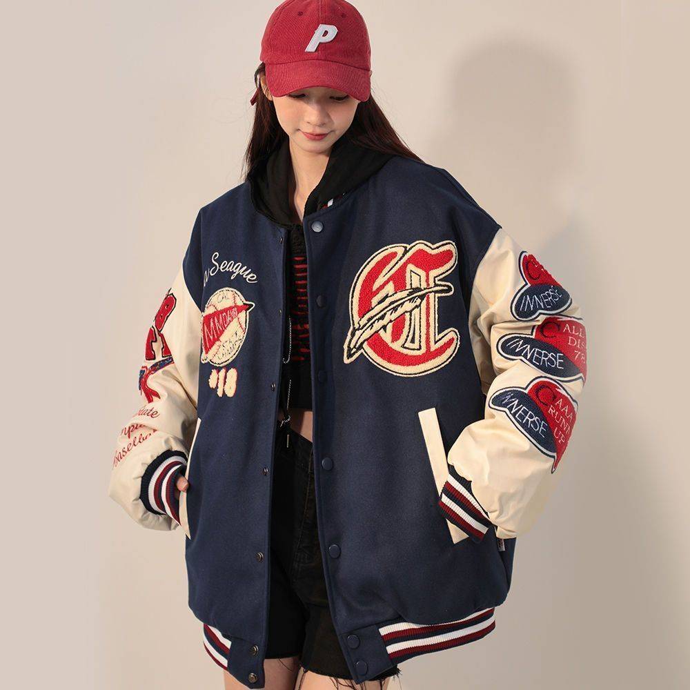 国潮复古街头撞色拼接棒球服女秋冬季加绒加厚百搭学生夹克外套潮