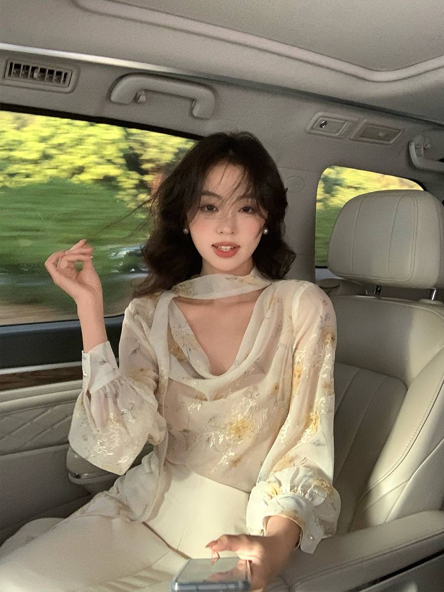 秀熙熙2025春季千金风通勤荡领系带印花衬衫显瘦长袖上衣女89249