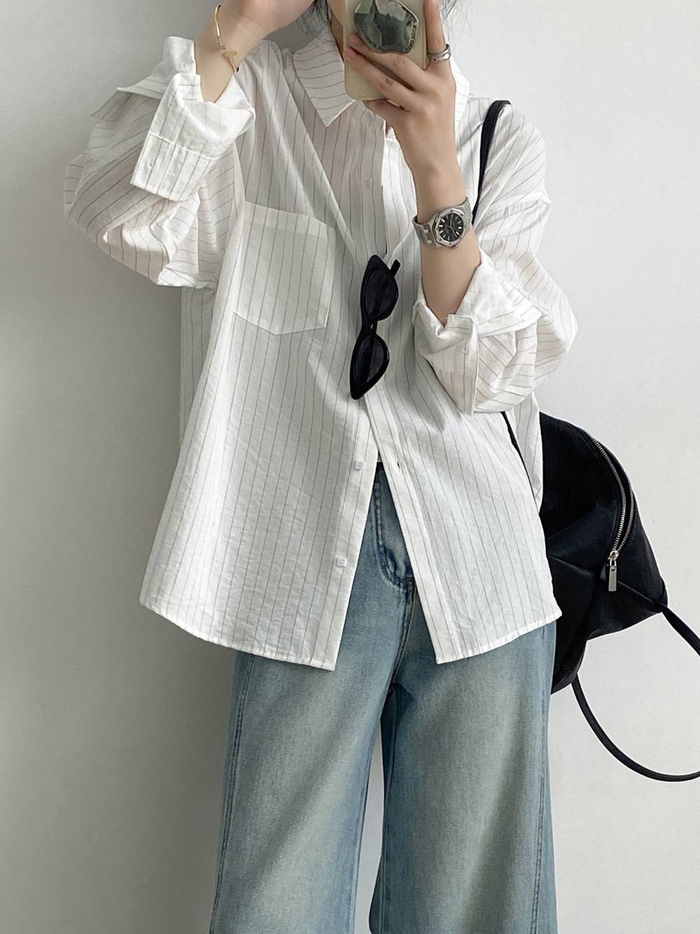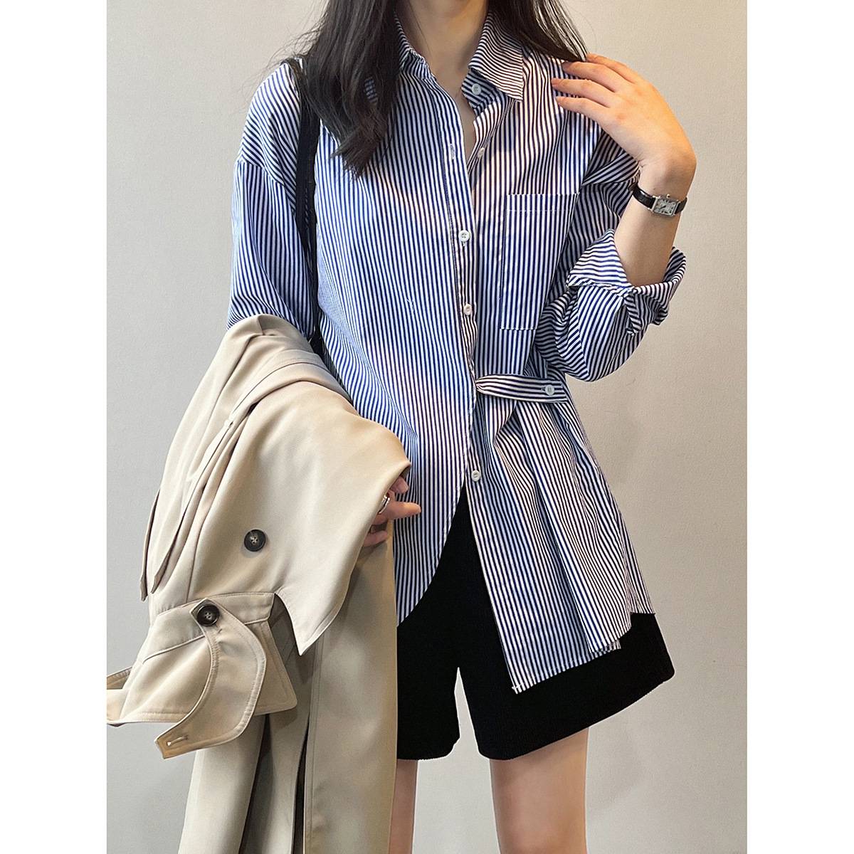 言双 气质休闲条纹衬衫女 春季韩版百搭宽松长袖开衫上衣82205