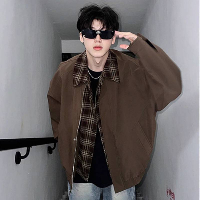 古着vintage棕色外套男秋冬美拉德穿搭假两件夹克翻领短款棒球服