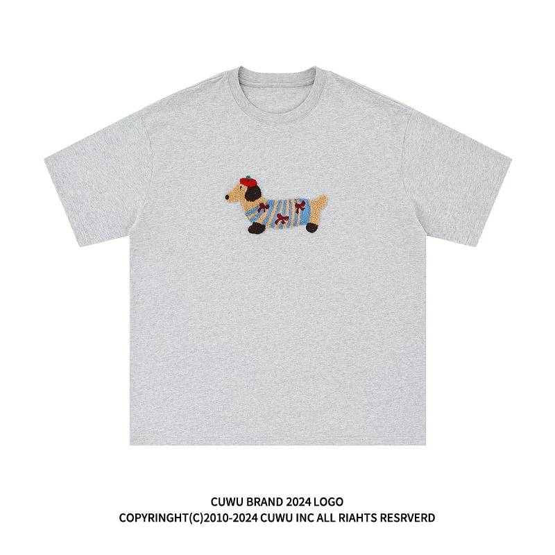 cuwu腊肠小狗刺绣短袖t恤女2025新款夏季美式小众设计感白色上衣