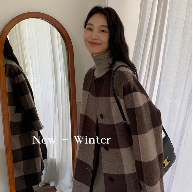 24年秋冬季新款高级感撞色大格设计经典百搭无领长款双面羊毛大衣