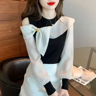 2025春季新款气质名媛风时尚拼色露肩长袖雪纺衬衫女时髦衬衣上衣