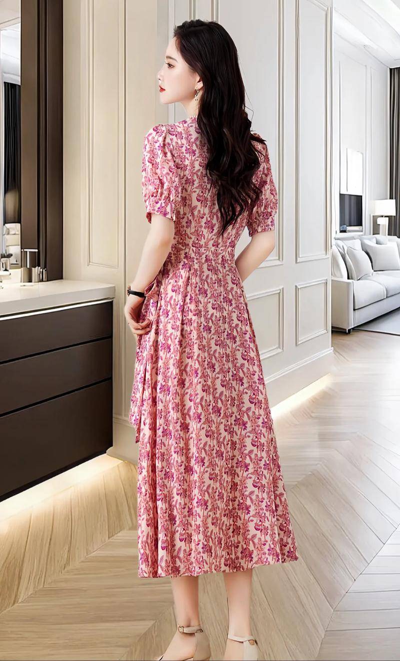 2020年秋装新款碎花雪纺连衣裙中长款收腰显瘦长袖裙子