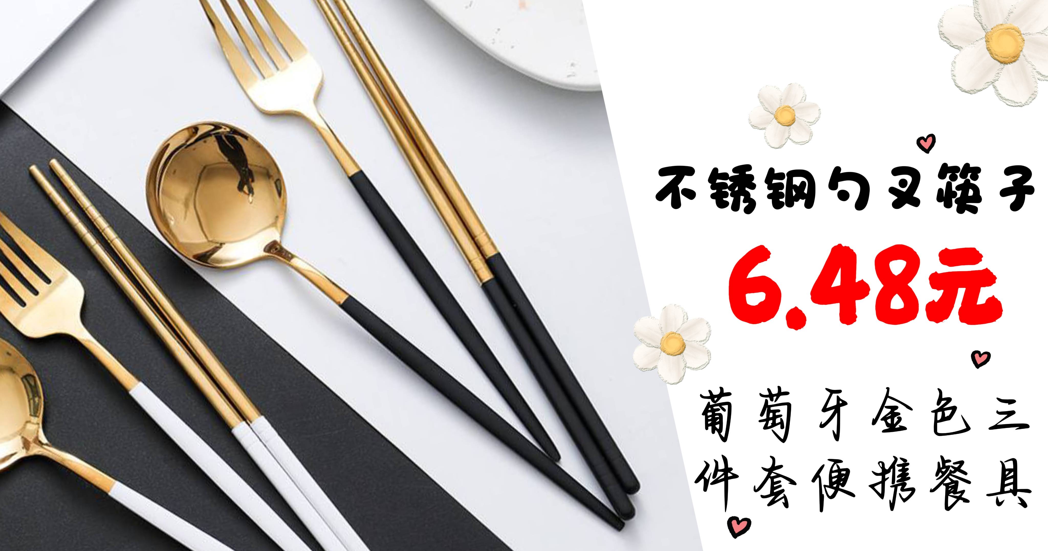不锈钢葡萄牙金色三件套学生旅行户外北欧ins风便携餐具勺叉筷子实惠好用