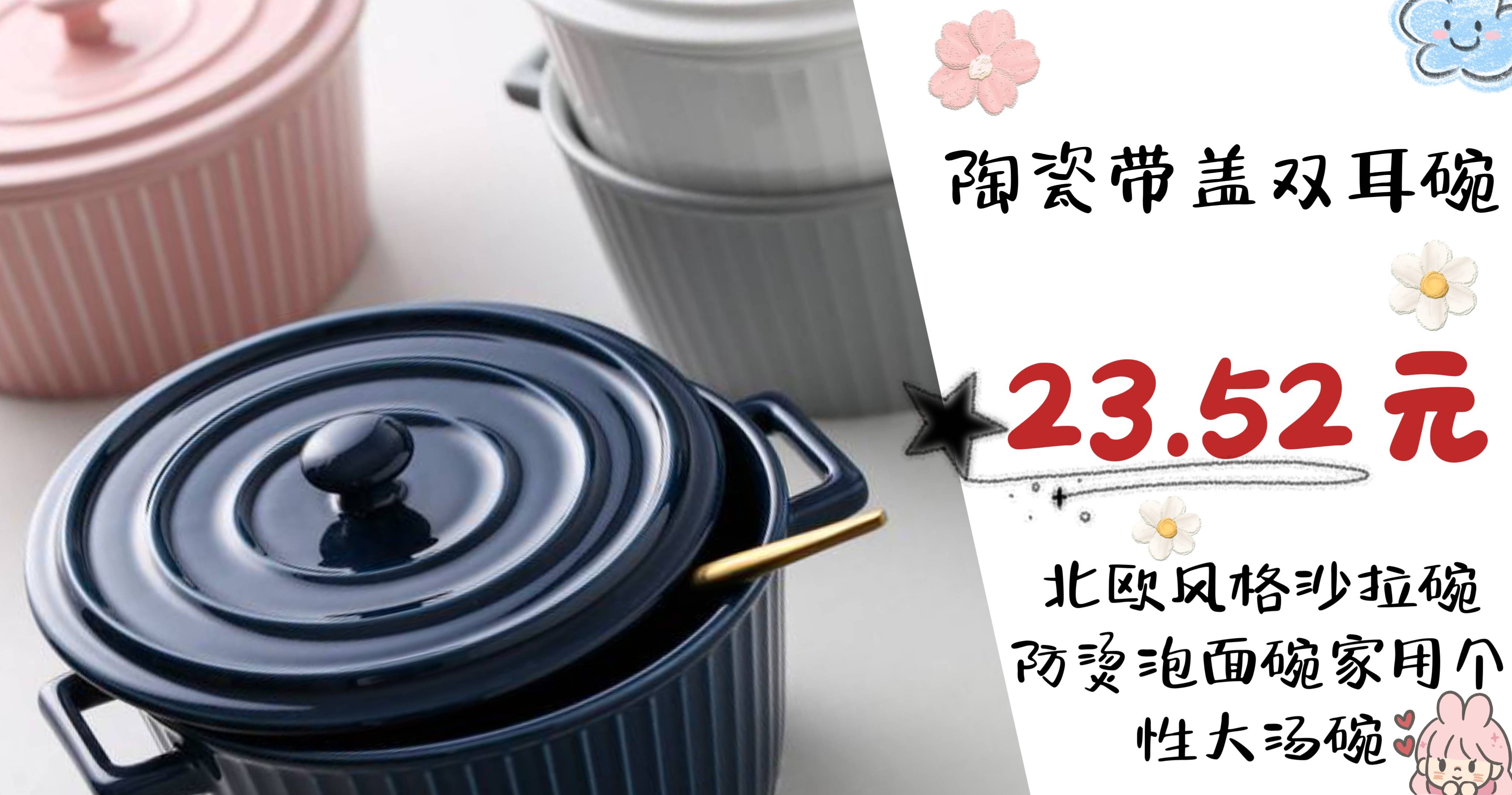 北欧风格简约陶瓷带盖双耳碗沙拉碗防烫泡面碗家用个性大汤碗