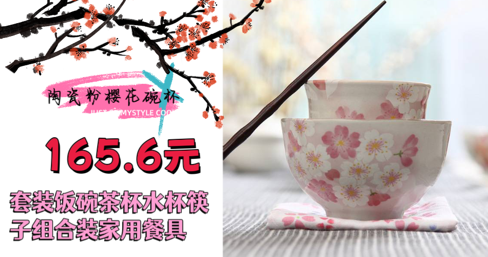 日本进口和蓝陶瓷粉樱花碗杯套装饭碗茶杯水杯筷子组合装家用餐具