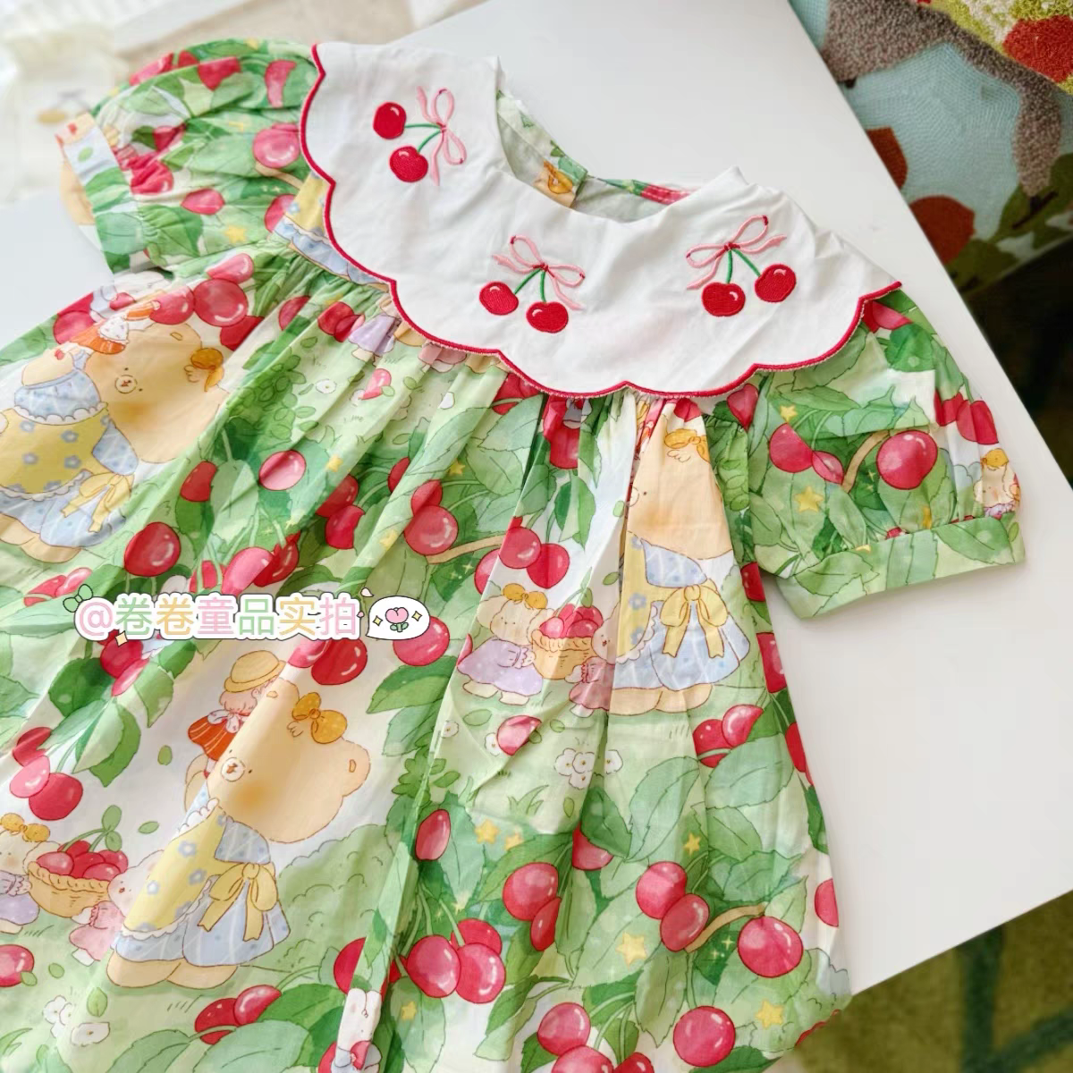 小熊樱桃女童连衣裙 甜美可爱女孩纯棉夏款娃娃裙宝宝翻领刺绣裙