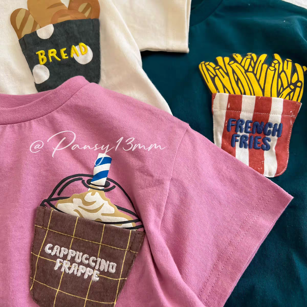 日系三色面包薯条T恤儿童夏款短袖纯棉T潮牌风纯色男女童
