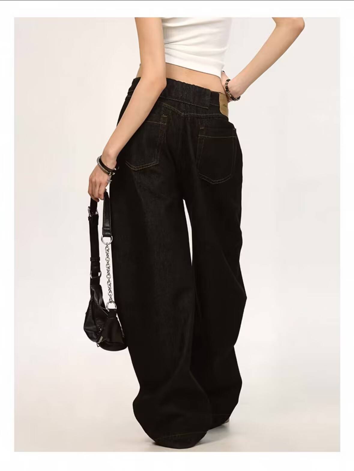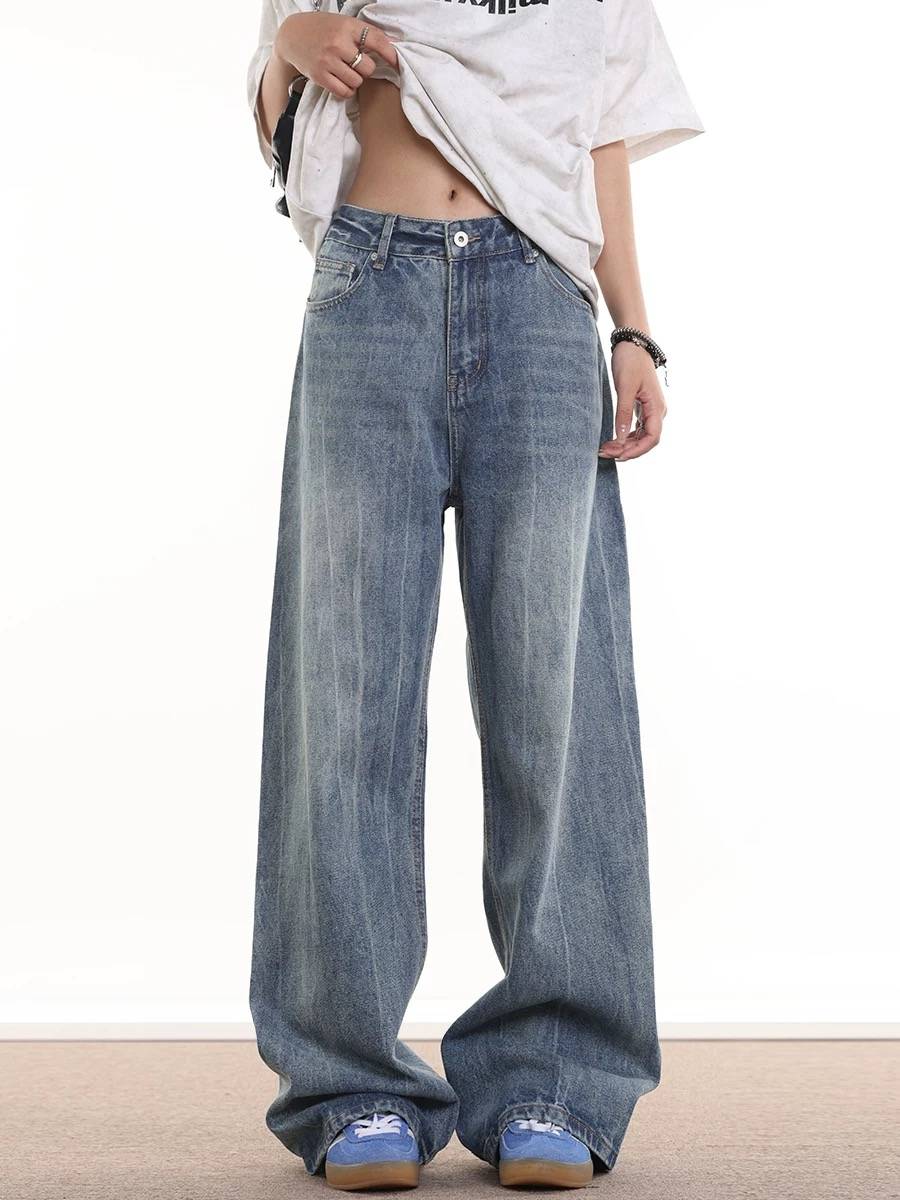 0123Start美式复古水洗蓝裂纹阔腿微喇牛仔裤男女直筒高街宽松