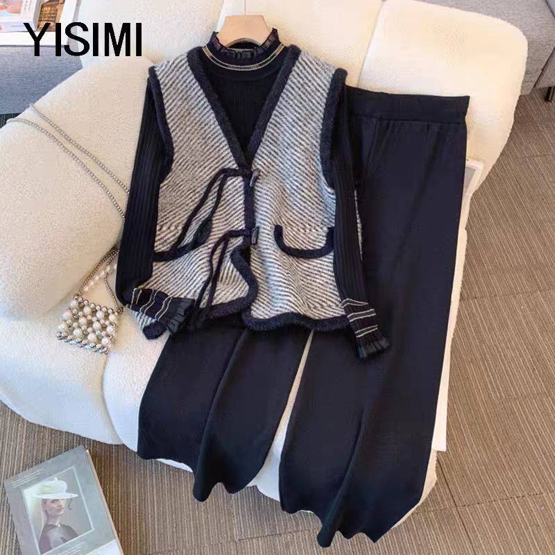 胖妈妈秋装新款小香风针织马甲三件套中老年女士宽松阔腿裤套装女